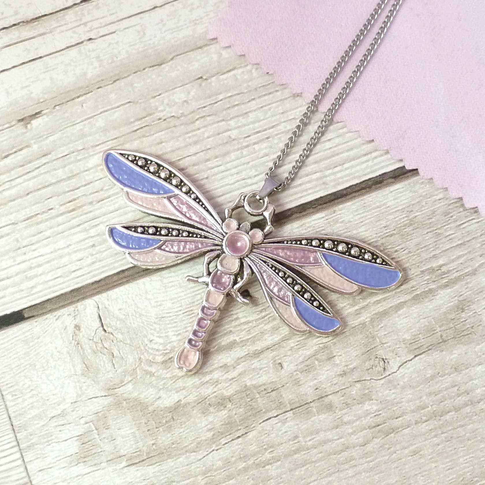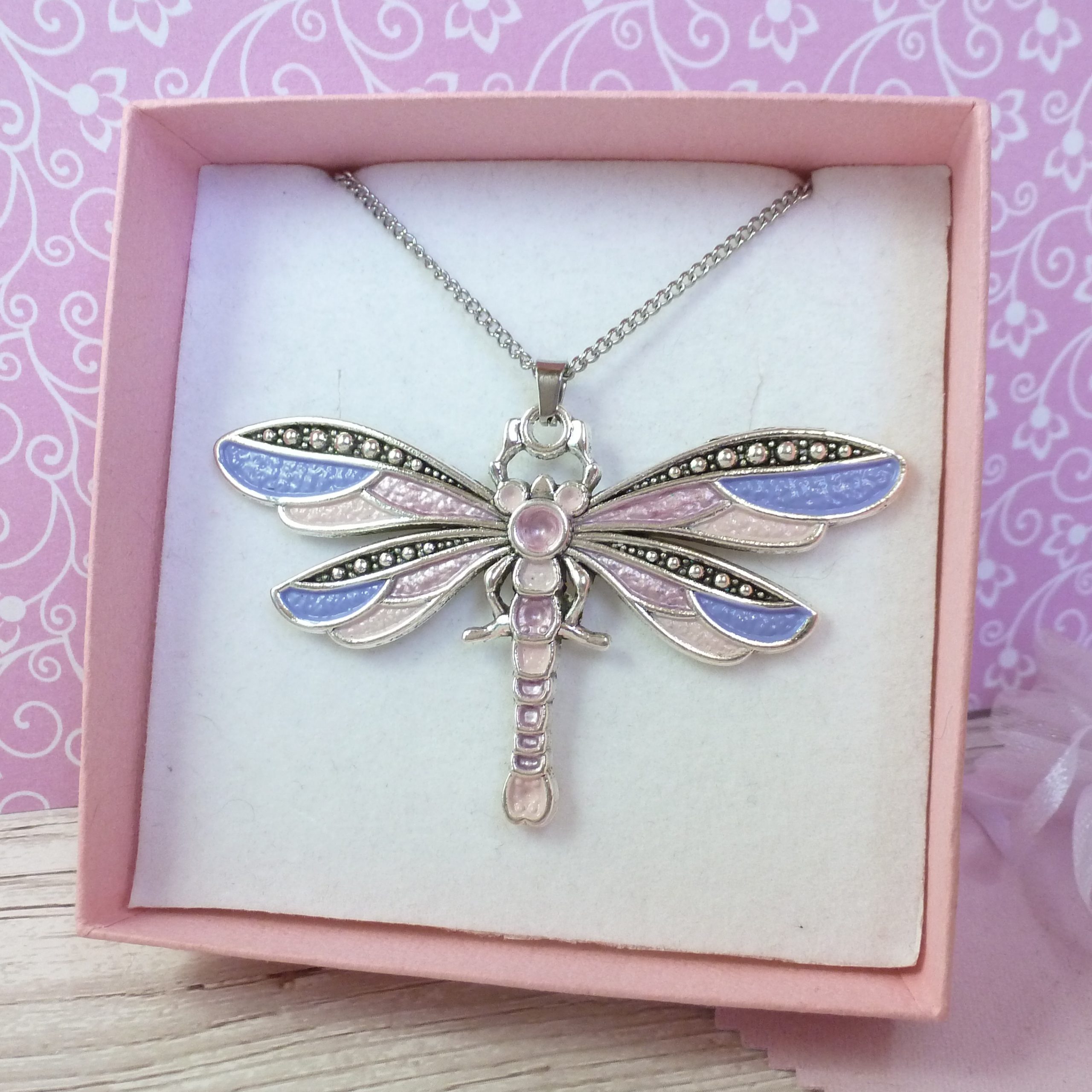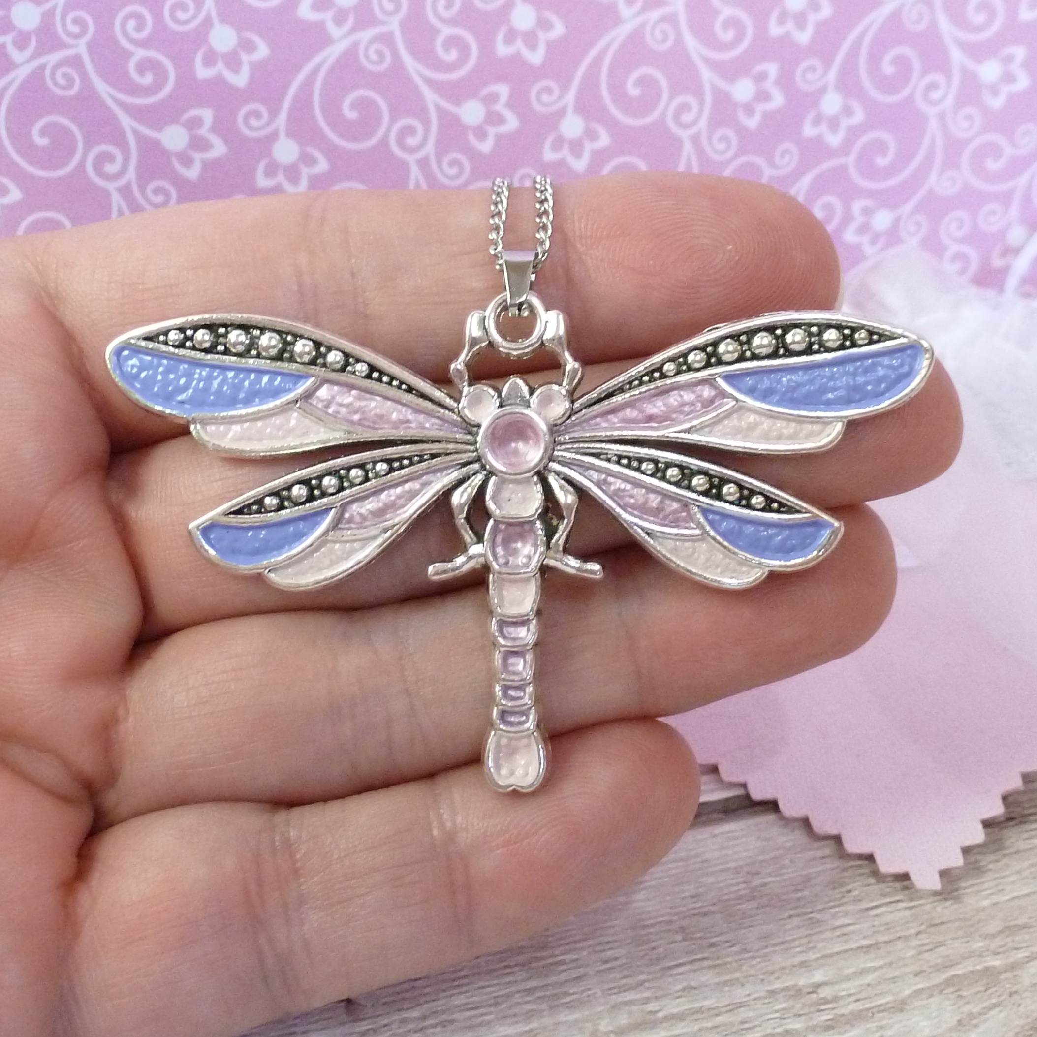 This silver metal dragonfly pendant is handpainted with lilac, pale pink and rose gold enamels. There are two chain options available – a plain Stainless Steel chain of 45cm, fastened with a lobster clasp, or a longer 69cm Stainless Steel ball chain that requires no fastening.