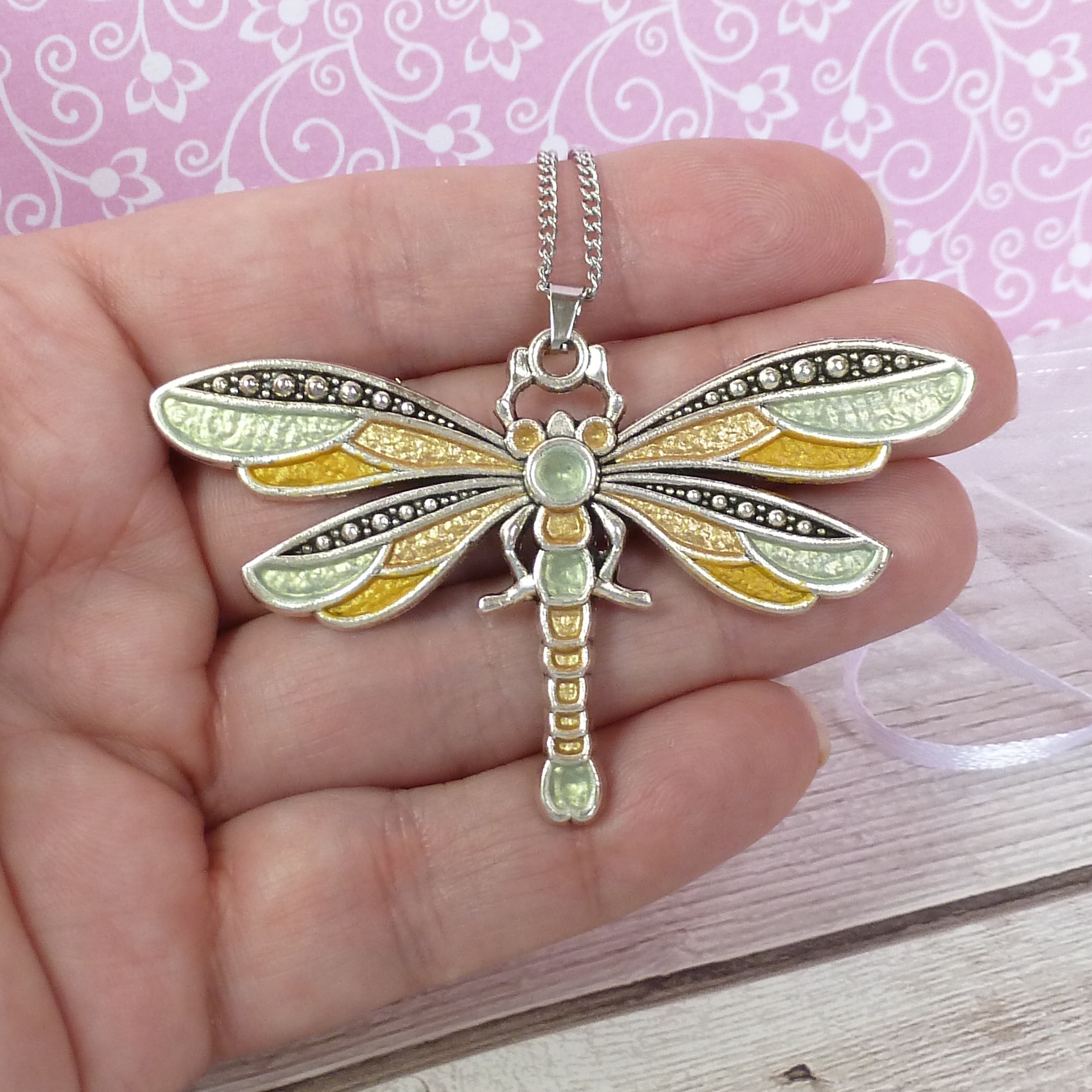 This silver metal dragonfly pendant is handpainted with metallic lime green, gold and metallic gold enamels. There are two chain options available – a plain Stainless Steel chain of 45cm, fastened with a lobster clasp, or a longer 69cm Stainless Steel ball chain that requires no fastening.